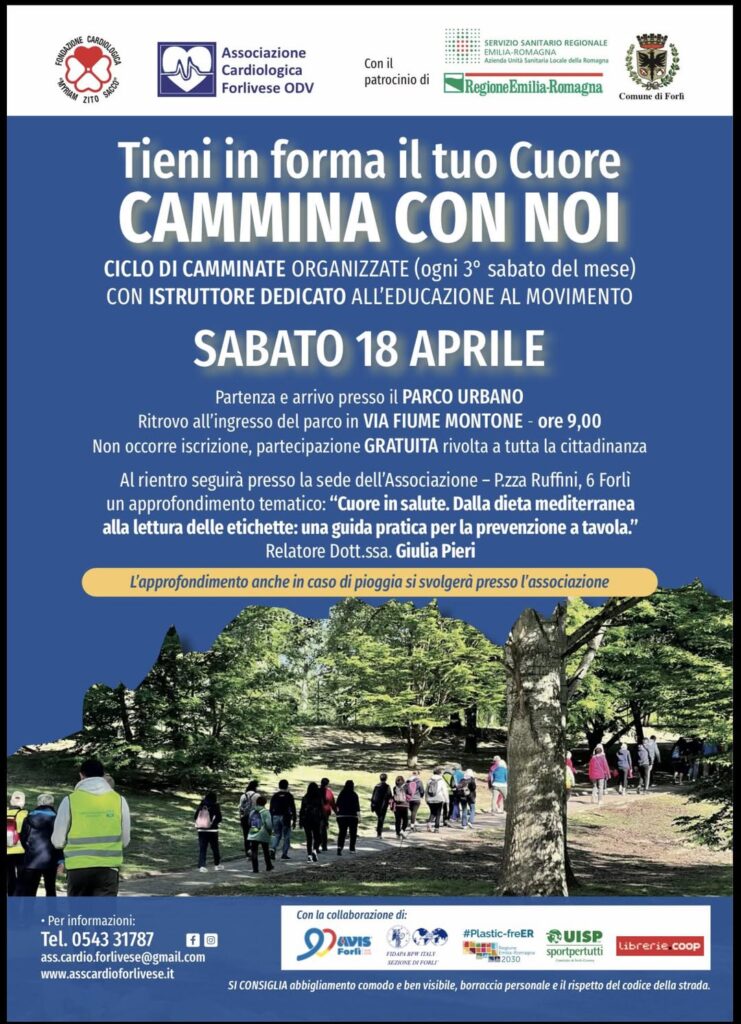 Per la nostra camminata mensile vi invitiamo inoltre a partecipare all’interessante approfondimento tematico dopo la camminata presso la sede dell’Associazione “Cuore in salute ” Dalla dieta mediterranea alla lettura delle etichette: una guida pratica per ls prevenzione a tavola. – Relatrice la Dott.ssa Giulia Pieri.