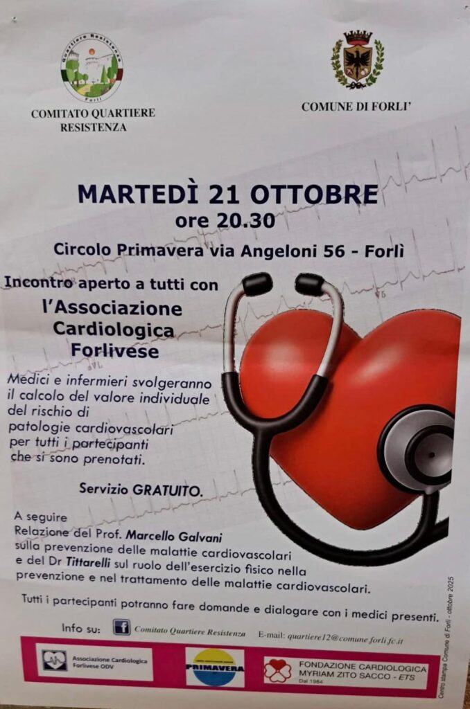 Si è svolto l’incontro a cura di Associazione Cardiologica Forlivese c/o il Circolo Primavera Martedì 21 ottobre 2025. Informare aiuta a prevenire…inoltre i nostri medici e infermieri volontari hanno effettuato il calcolo individuale del rischio agli intervenuti
